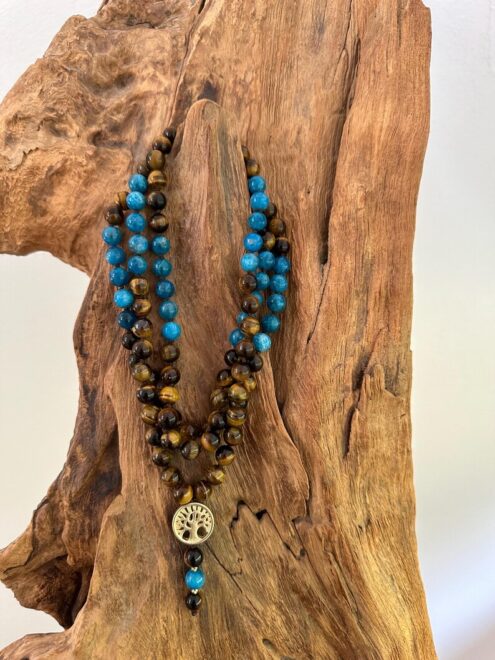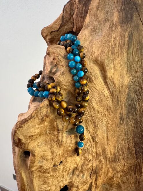 6mm große Perlen mit einer größeren Apatit-Perle als Guruperle und 2 kleinen vergoldeten Zwischenteilen (ca. 45cm Länge)