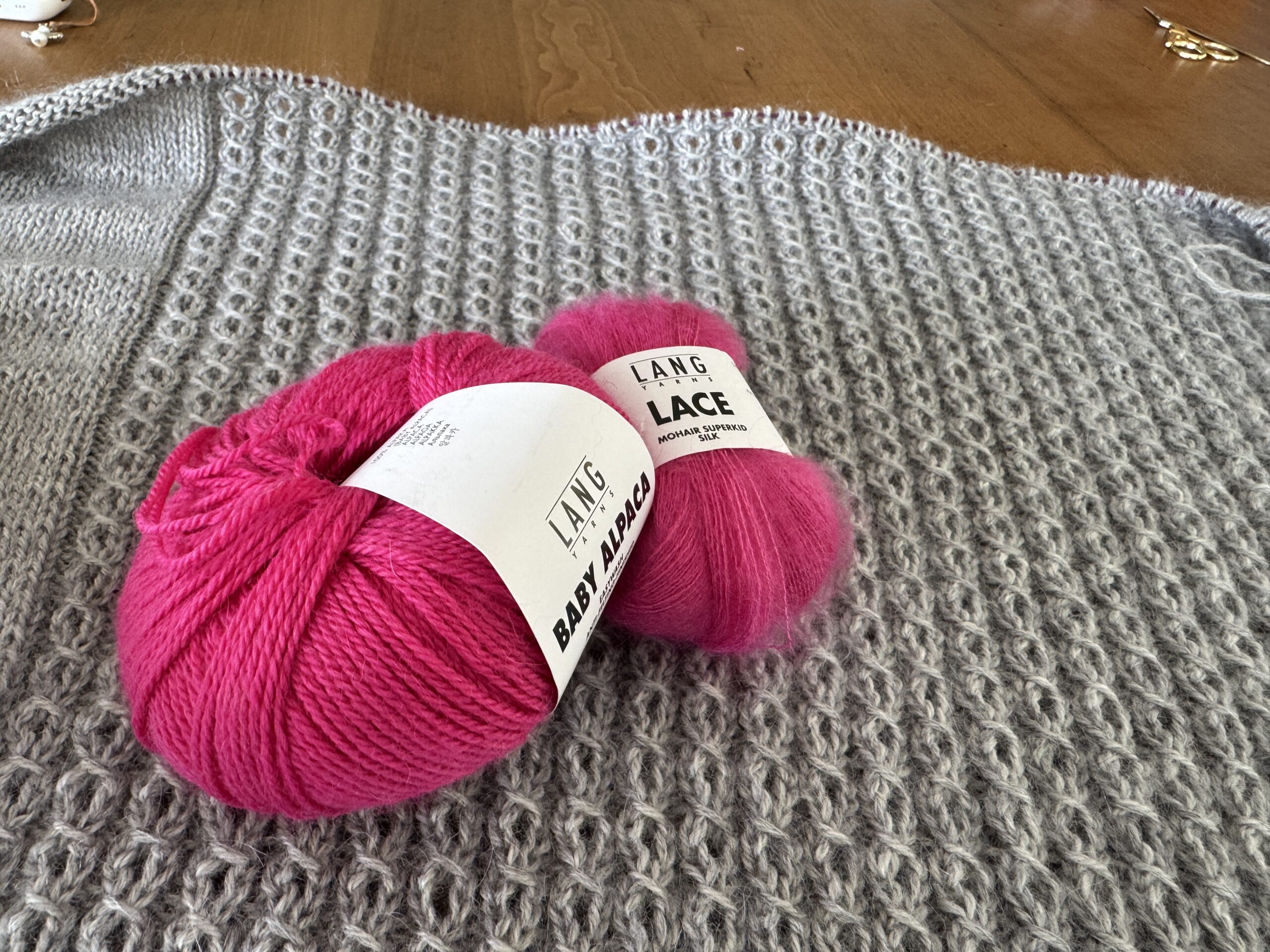 Wenn du wie das Original mit 2 Farben stricken möchtest, benötigst du jeweils ca 930 m für die Hauptfarbe (grau) und jeweils ca. 150m für die Kontrastfarbe (pink)