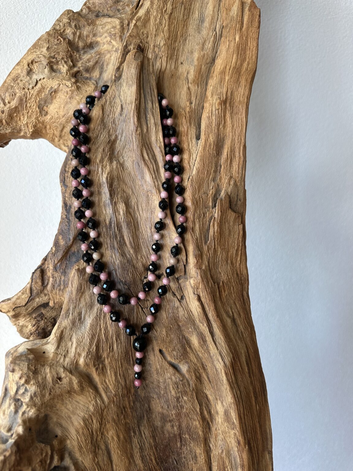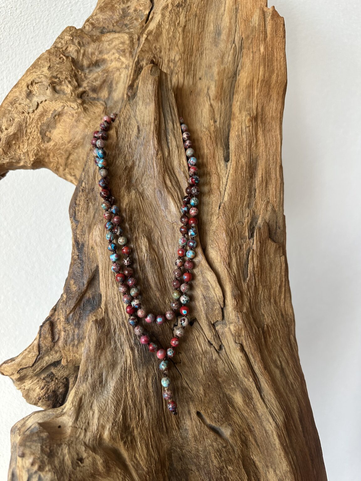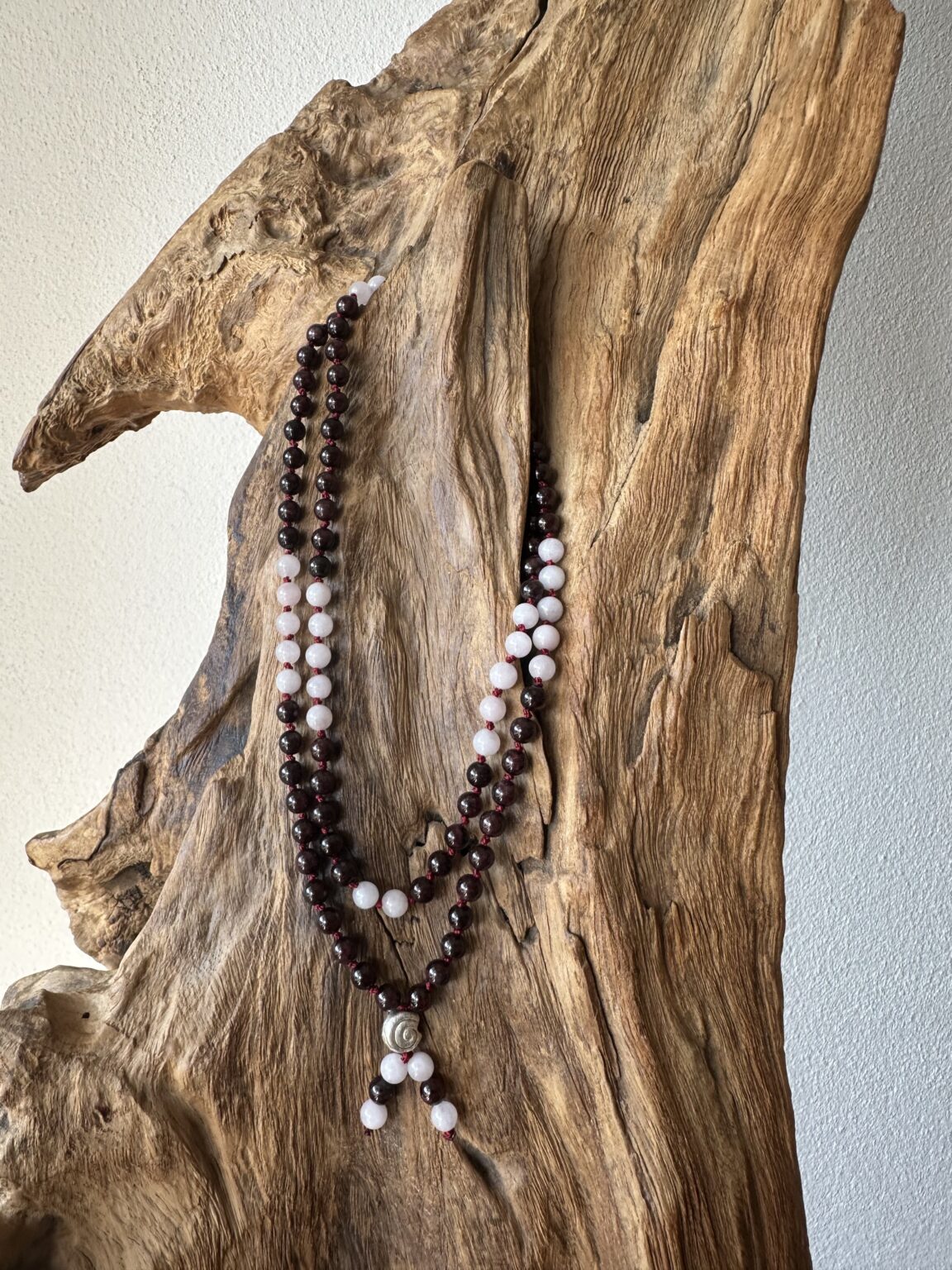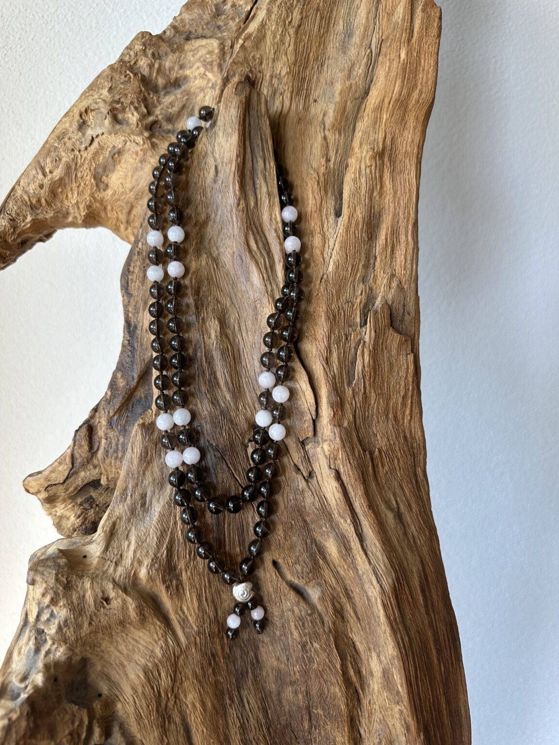 Die Mala wird von mir auf einer weißen Seidenschnur geknotet und ist ca. 42 bzw. 49 cm lang. Jede Mala ist ein Unikat!